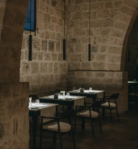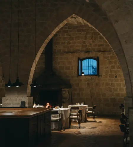 Il luogo è austero ma suggestivo. Pareti in pietra, pavimento in cotto siciliano, frammenti storici per mobili e oggetti e una calda ma silenziosa illuminazione rendono l’ambiente decisamente unico.